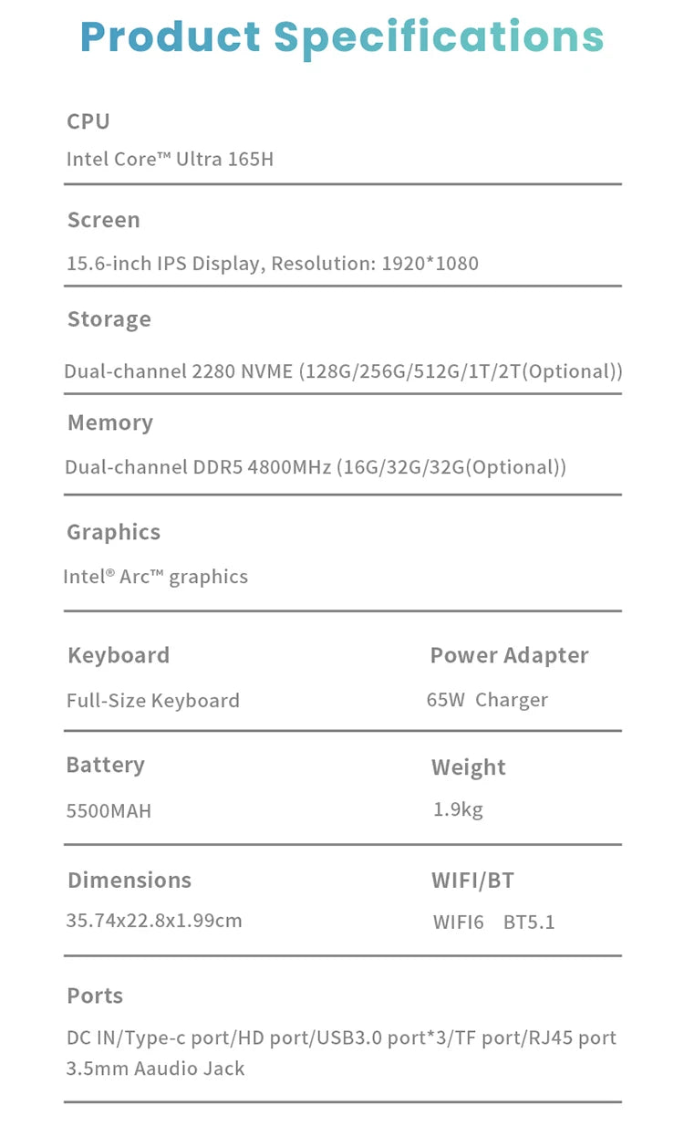 Arc Graphics DDR5 4800Mhz M.2 2280 Business Gaming Laptops Genmachine Laptop Computer Intel Core Ultra 165H 16C 22T 15.6” 60Hz